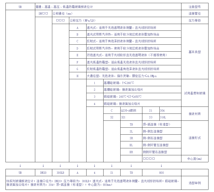 UB系列普通、高温、高压、低温防霜、大通径型玻璃板液位计可直接用来指示各种工业容器内介质的液位高度。在工作温度260℃以下采用经过热处理硼硅酸盐玻璃,260℃以上采用经过热处理特殊加工的铝硅酸盐玻璃,能承受420℃介质温度。在接液面上覆盖一层云母。